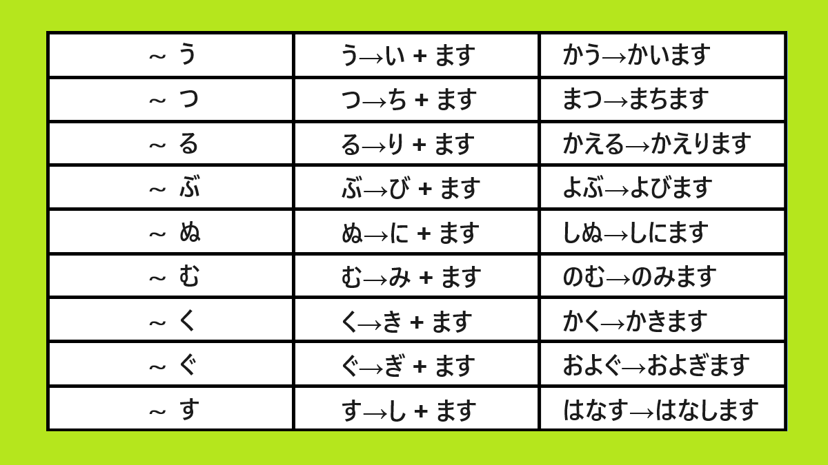 Untuk mengubah bentuk verba kamus kelas 1 menjadi verba bentuk masu adalah dengan mengubah akhiran vokal u menjadi i, kemudian ditambahkan masu setelahnya.
