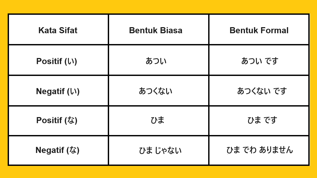 Untuk mengetahui cara mengubah bentuk positif dan negatif kata sifat bahasa Jepang, silakan baca pembahasan berikut ini.